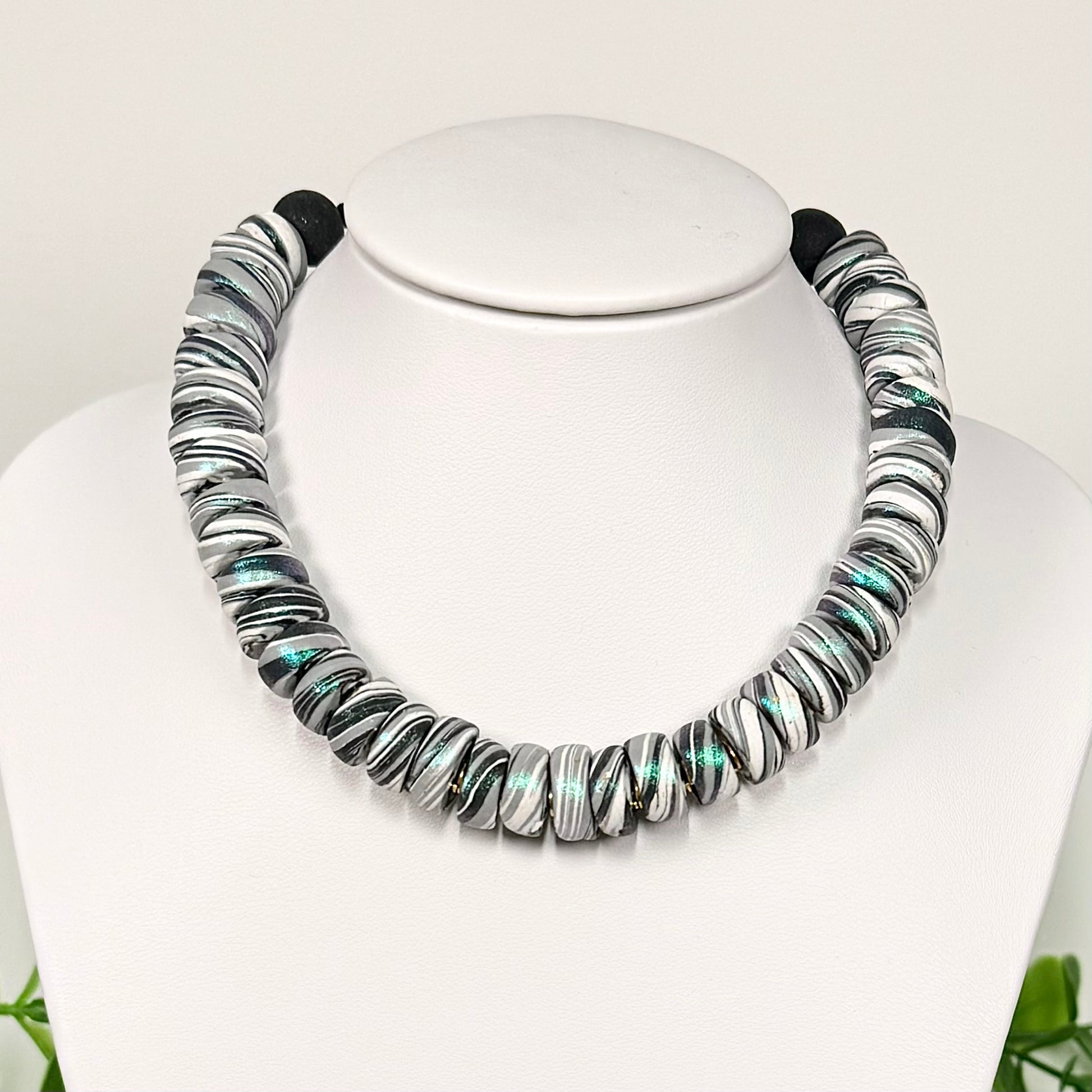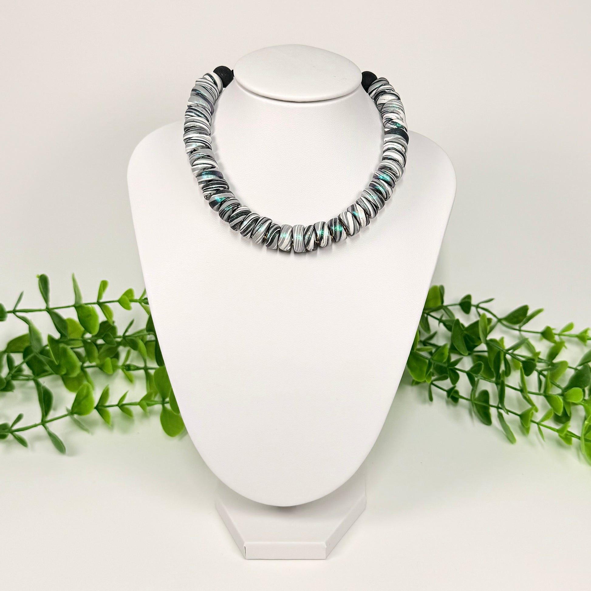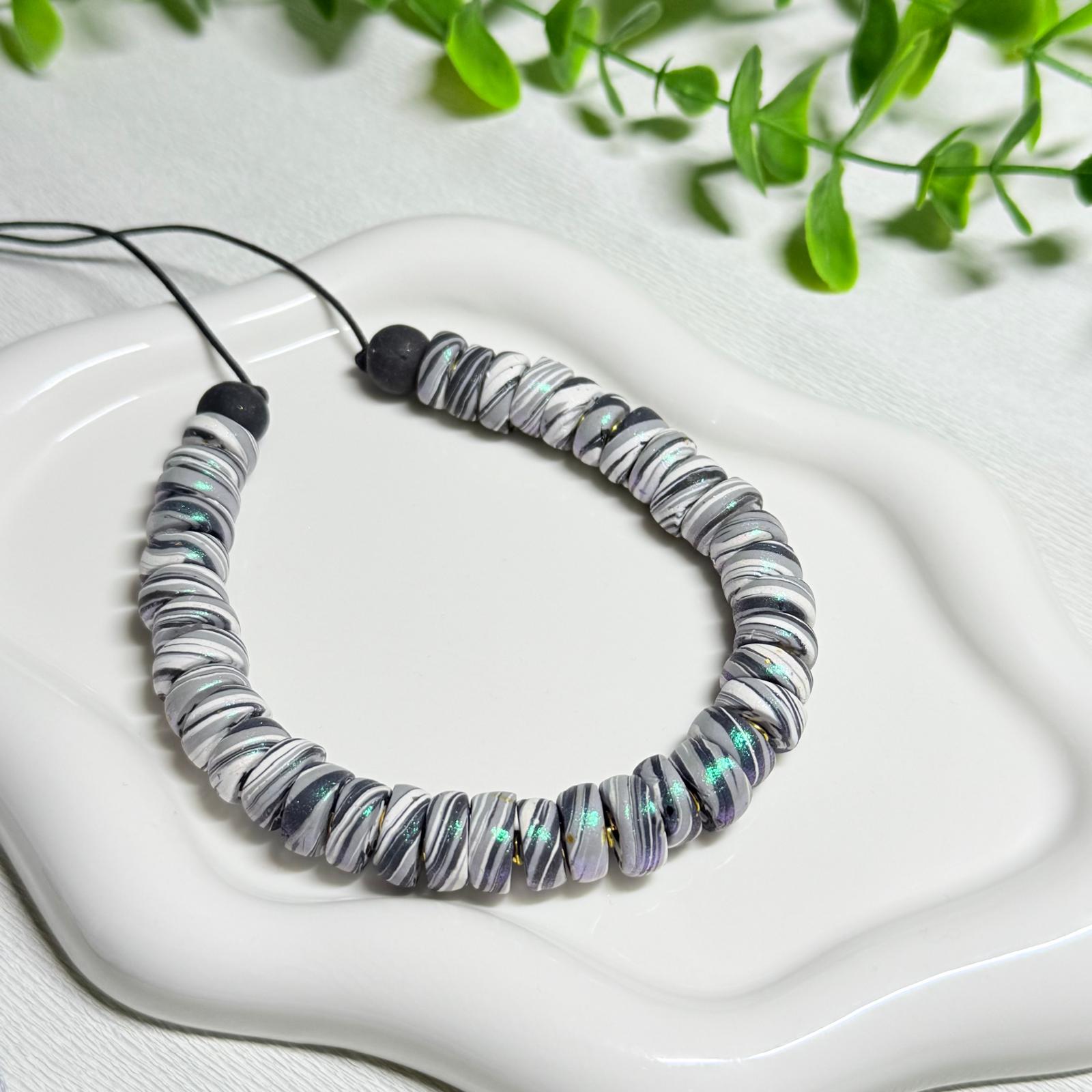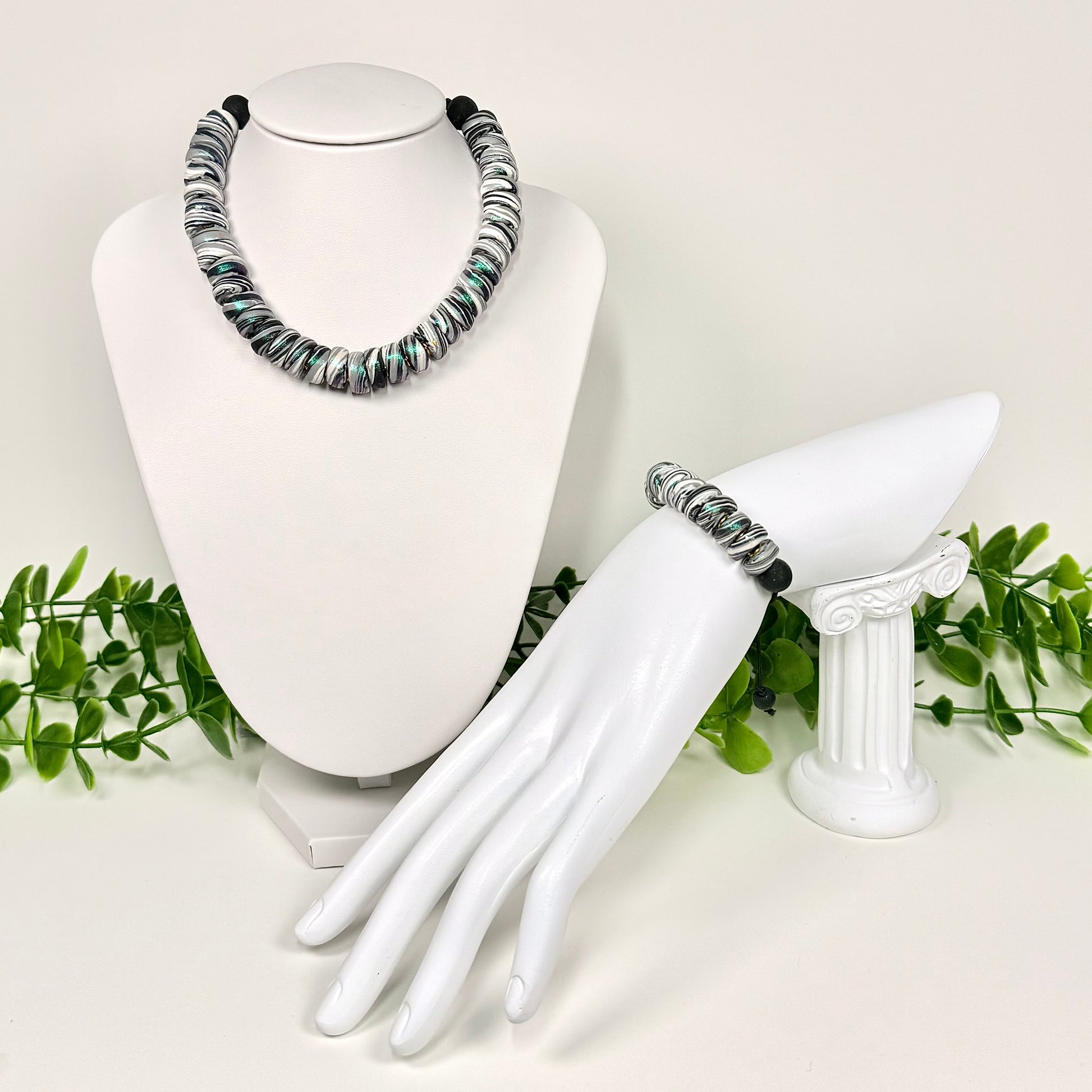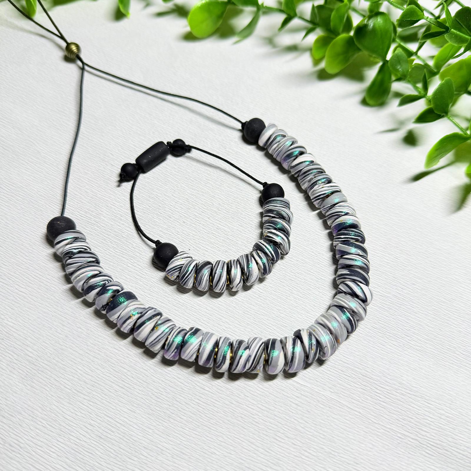 Elevate your accessory collection with the Black and White Dual-Tone Galaxy Polymer Clay Beaded Set. This refined ensemble features an adjustable necklace and bracelet, expertly crafted with polymer clay beads that showcase a sophisticated galaxy-inspired design. The purple to green dual-tone shine allow you to experience a perfect blend of artistry and versatility with this distinctive set.
