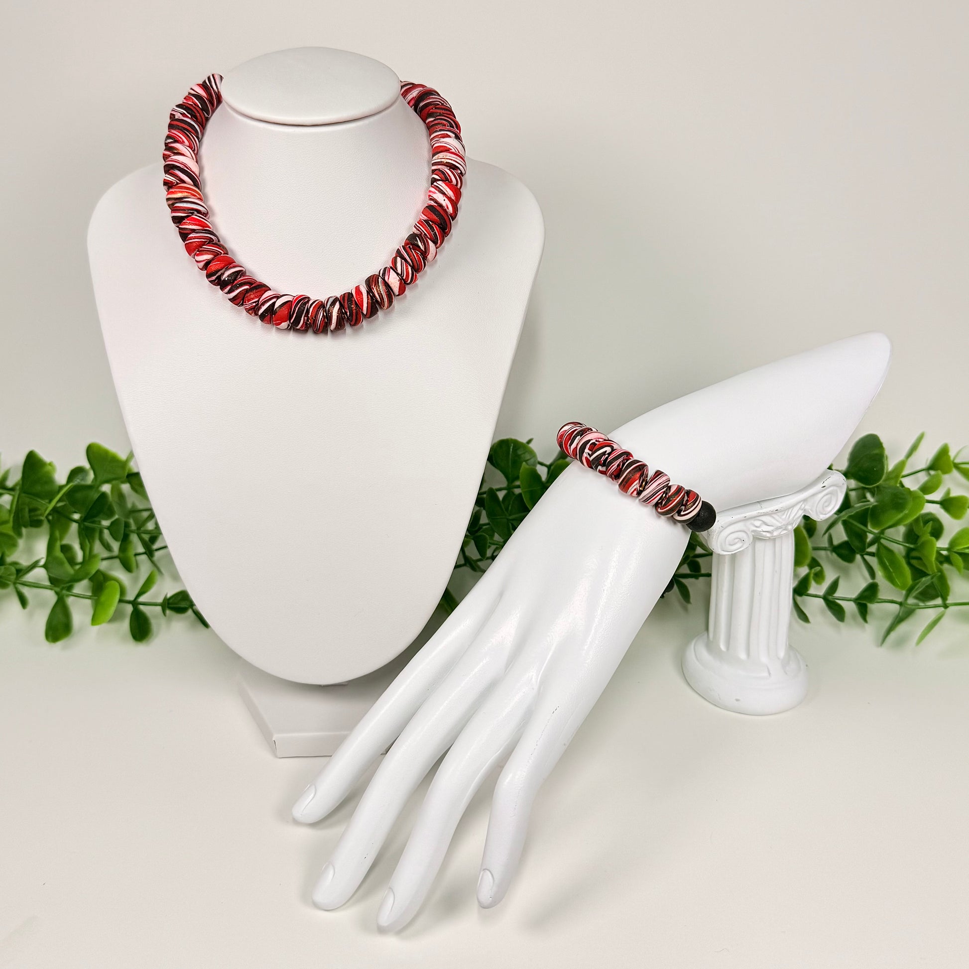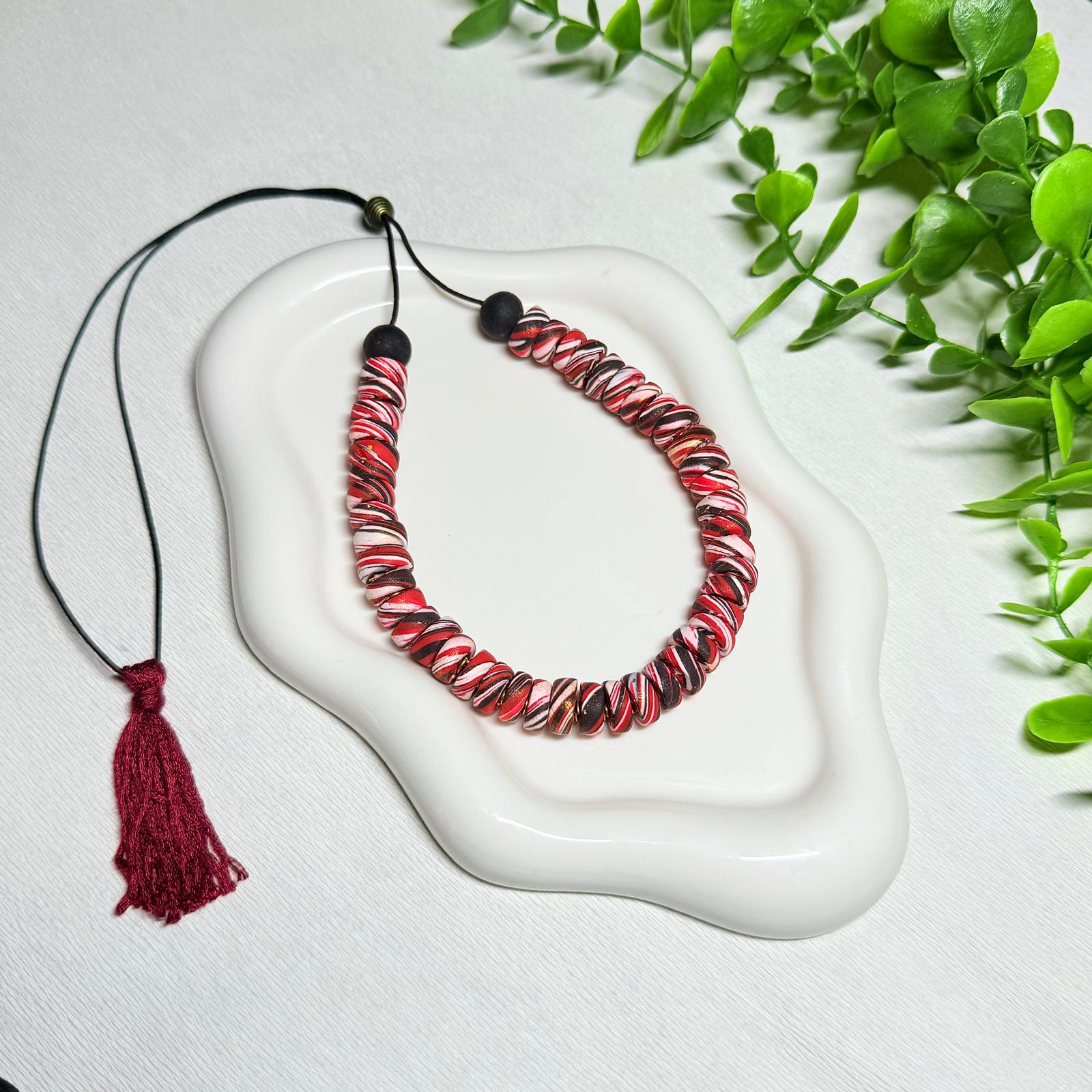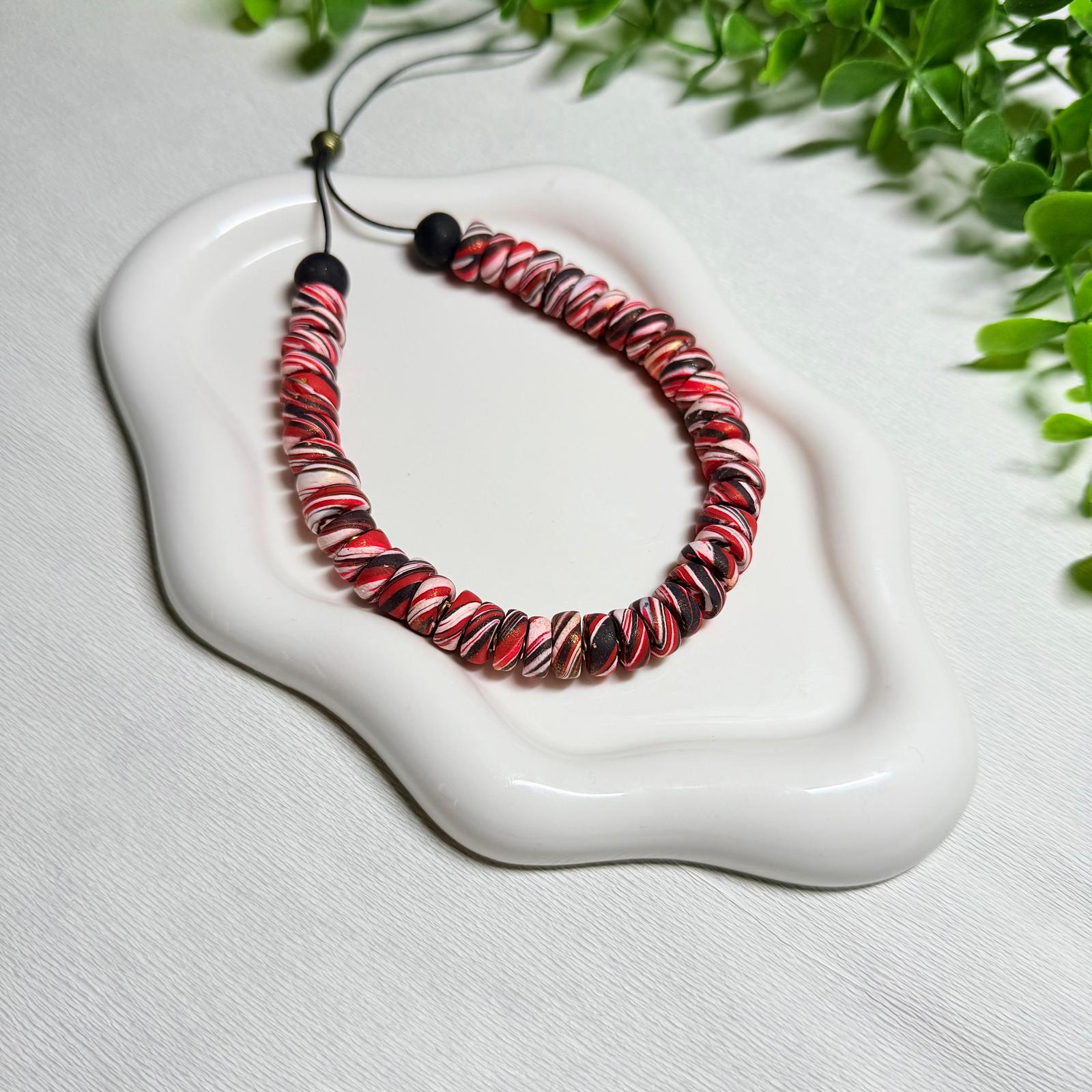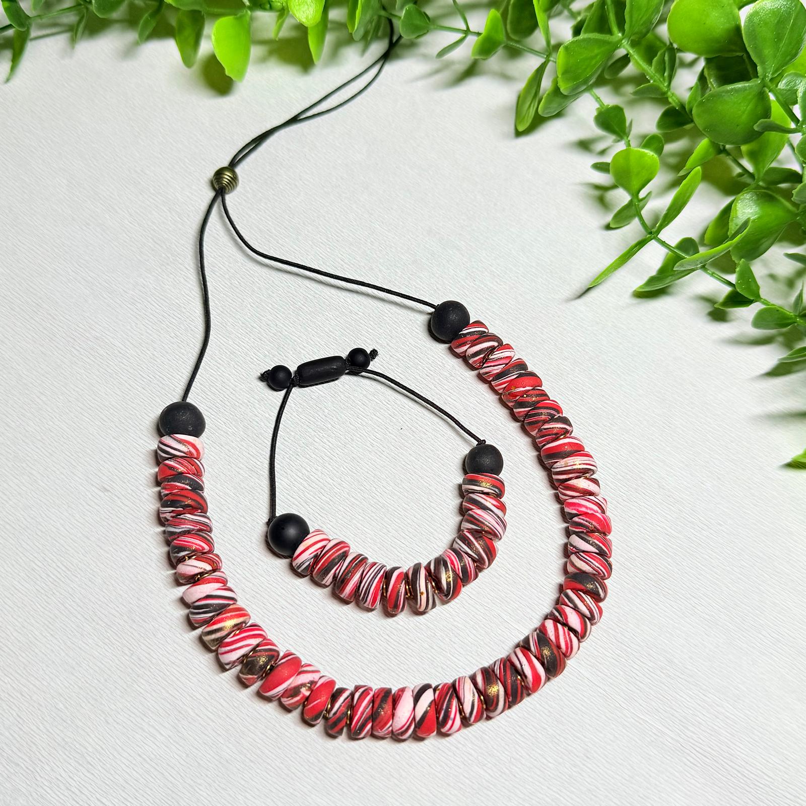 Brighten your look with the Ruby Red Galaxy Polymer Clay Beaded Set! Featuring an adjustable necklace and bracelet, this set combines vibrant red beads with a fun galaxy-inspired design.